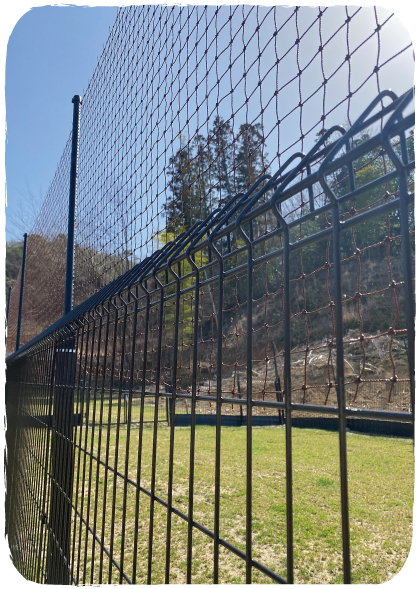 鉄製のベース(1200m)+ネット(900m)/合計=高さ2100m。 当施設は国道沿いにあること、犬種を問わず安心して開放できる場所を目指しているため『犬の脱走』には最大限の注意を払った作りにしています